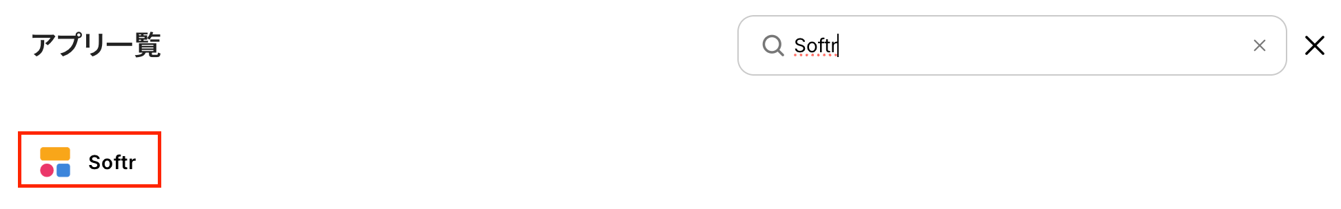 新規接続をクリックしたあと、アプリのメニュー一覧が表示されるのでSoftrと検索し対象アプリをクリックしてください。