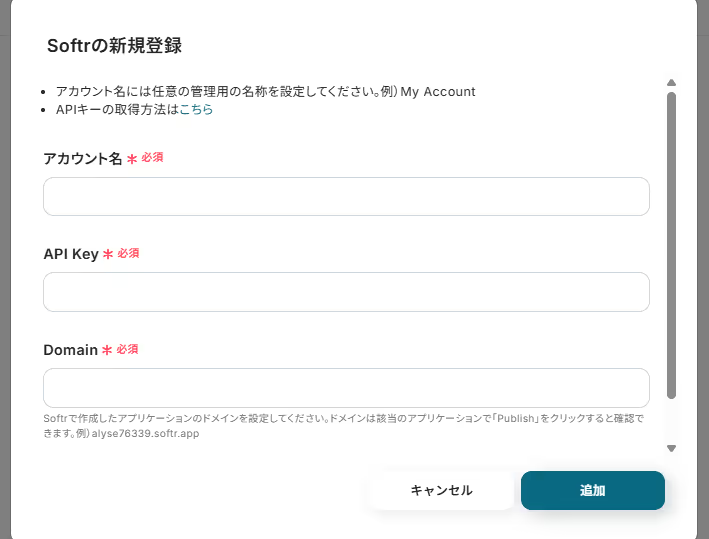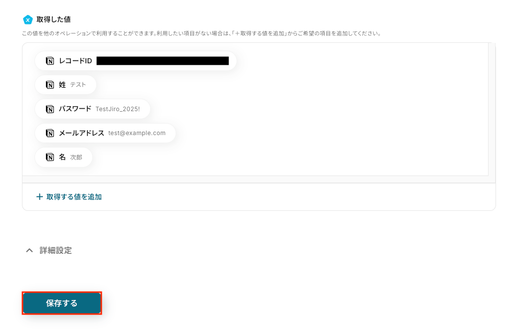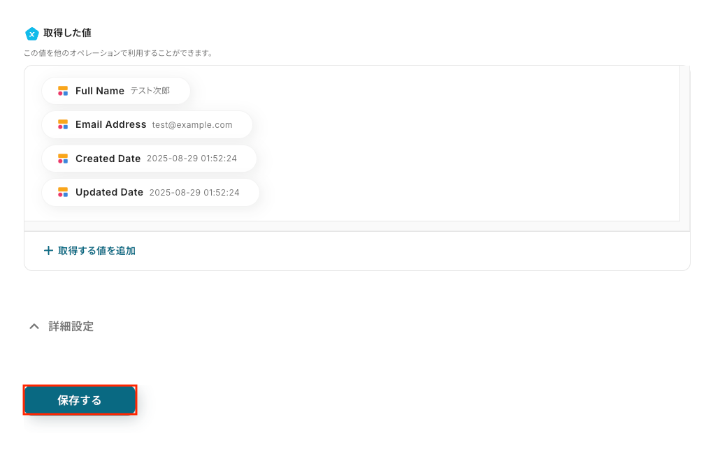 なお、テキストを直接入力した部分は固定値とされるため、取得した値を活用せず設定を行うと毎回同じデータがSoftrに登録されてしまうので注意が必要です。