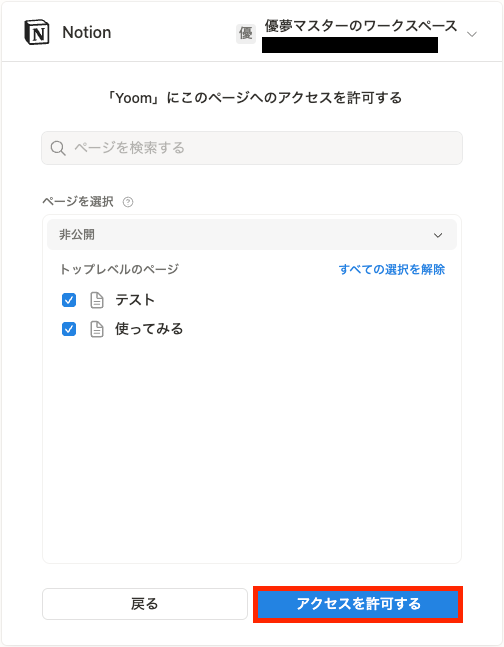 Yoomがアクセスできるページを選択し、「アクセスを許可する」をクリックします。