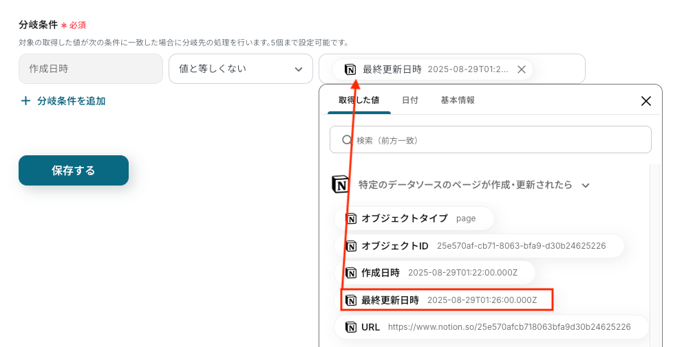 分岐条件 「作成日時」「値と等しくない」が選択されていることを確認しましょう。 右の値には「最終更新日時」を指定します。