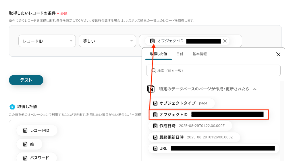 入力が完了したら、設定内容とトリガーの動作を確認するため「テスト」をクリックします。