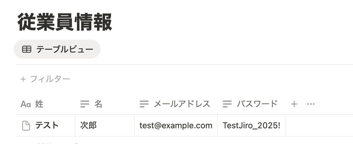 今回はテスト用に、従業員「テスト次郎」が追加されたことを想定し、以下のレコードを登録しました。
