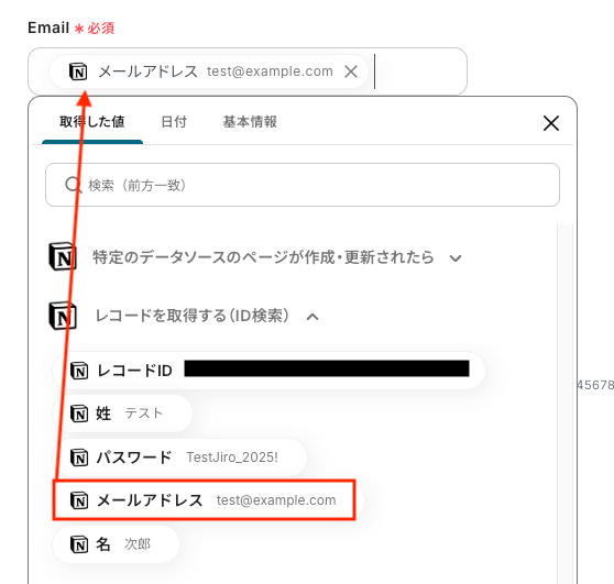 Email 入力欄をクリックすると、前のステップでNotionから取得した値が表示されるので、選択して入力しましょう。 取得した値を活用することで値が固定化されず、フローボットを起動するたびに最新の情報を自動で反映できます。