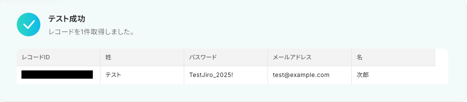 入力が完了したら、設定した条件に基づいて該当するレコードが正しく取得できるかを確認するため、「テスト」をクリックしましょう。