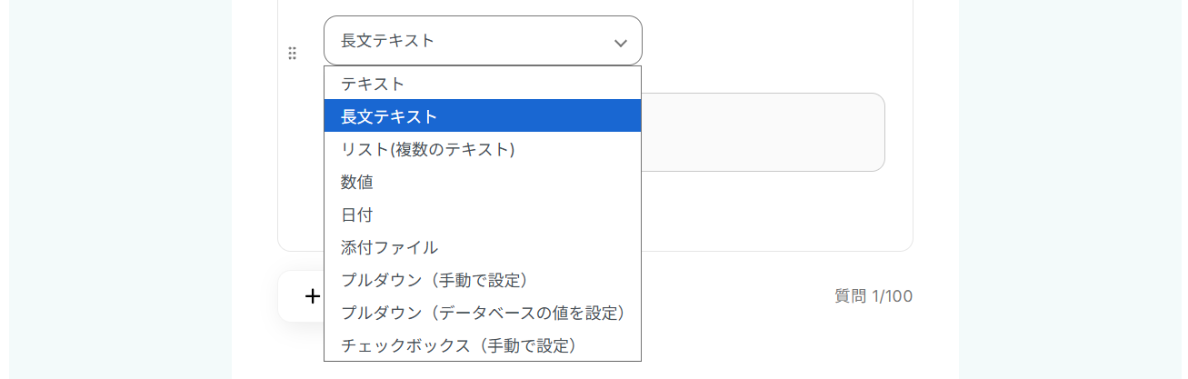 ・各質問項目:フォーム用に、名前や連絡先、質問内容等、必要な項目を設定します。