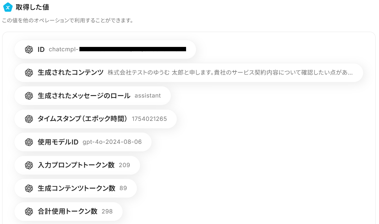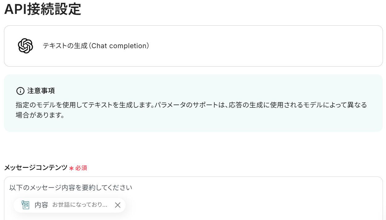 フォームの内容を要約します。「テキストの生成(Chat completion)」をクリック。