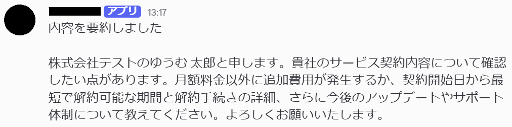 今回は例として以下のような問い合わせ内容をサンプルとしており、アウトプットとして次のステップで活用できます。