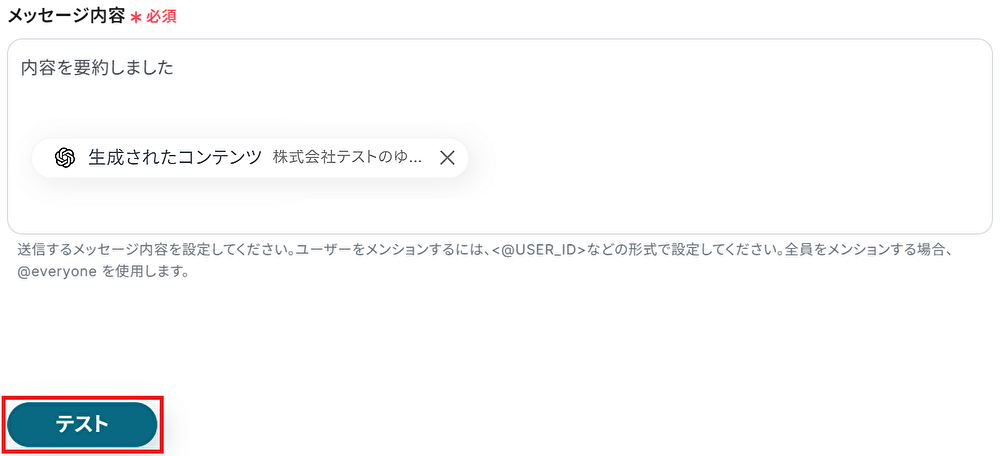 ※「テスト」をクリックすると設定したチャンネルに実際に投稿されます。テストの際はテスト用のチャンネルに投稿したり、事前にメンバーに通知しておくなどがおすすめです。