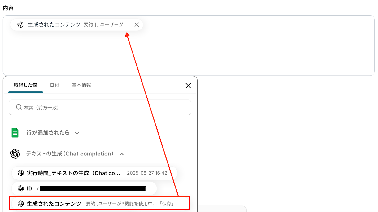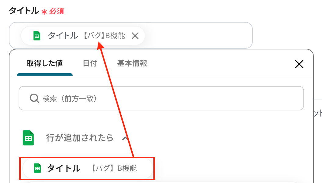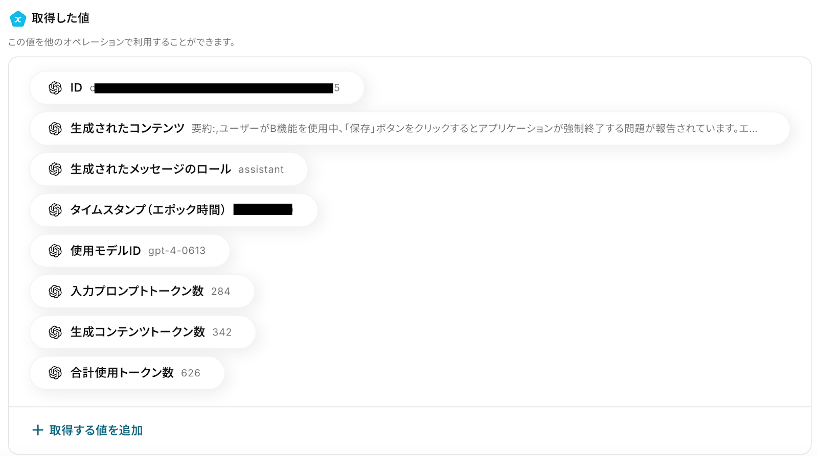 アウトプットとは、トリガーやオペレーション設定時に、「テスト」を実行して取得した値のことを指します。
