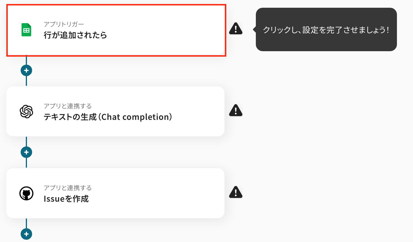 このワークフローは、Google スプレッドシートに行が追加されるだけで、OpenAIがその内容を分析・要約し、GitHubへ自動でIssueを作成します。