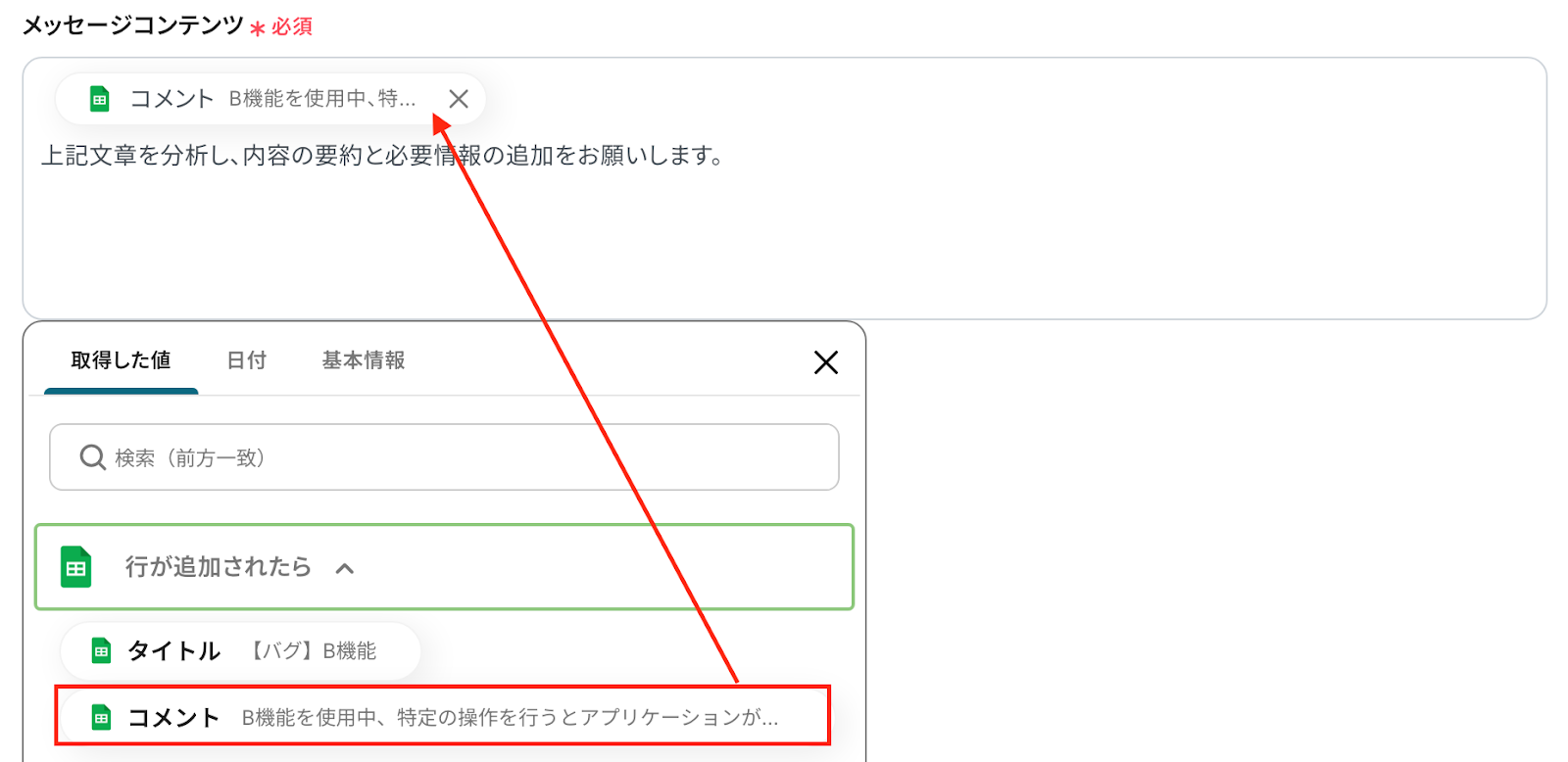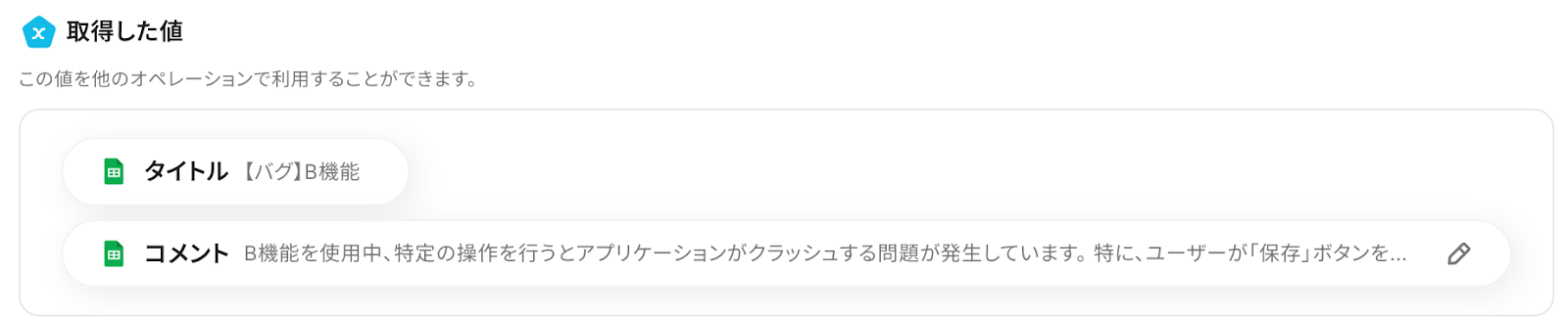 テストが成功すると「取得した値」に、先ほどGoogle スプレッドシートに追加した内容が表示されます。