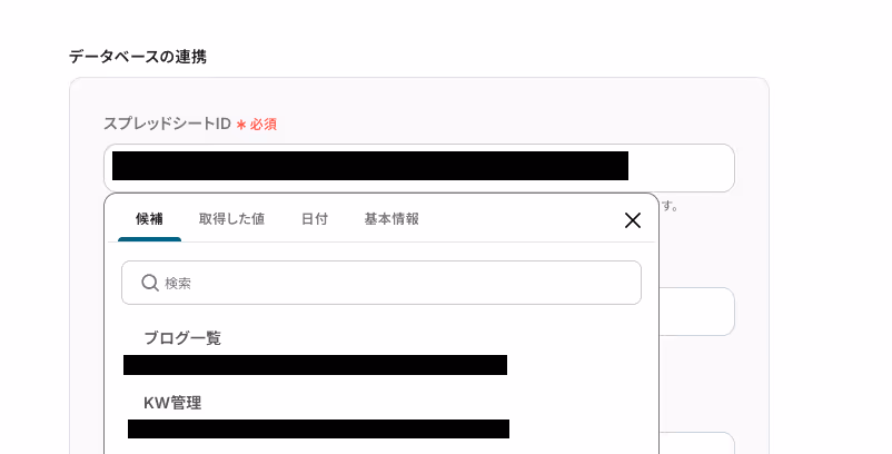 「スプレッドシートID」と「シートID」は、入力バーをクリックした後の『候補』から情報を選択してください。