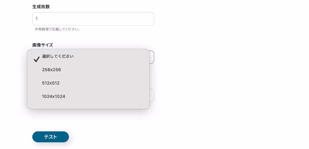 「生成枚数」は任意設定、「画像サイズ」や「フォーマット」はプルダウンから選択しましょう。(今回はURLを指定しています。)
