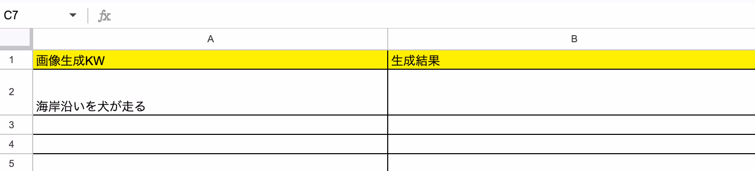 例えば、下記画像のように設定をした場合、Google スプレッドシートに新しく行が追加された際に「生成結果」という列に、AI作成された画像のURLが自動で貼り付けられるような動きになります。