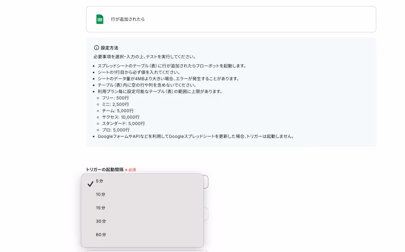 ※トリガーの起動タイミングは、5分、10分、15分、30分、60分のいずれかで設定できます。