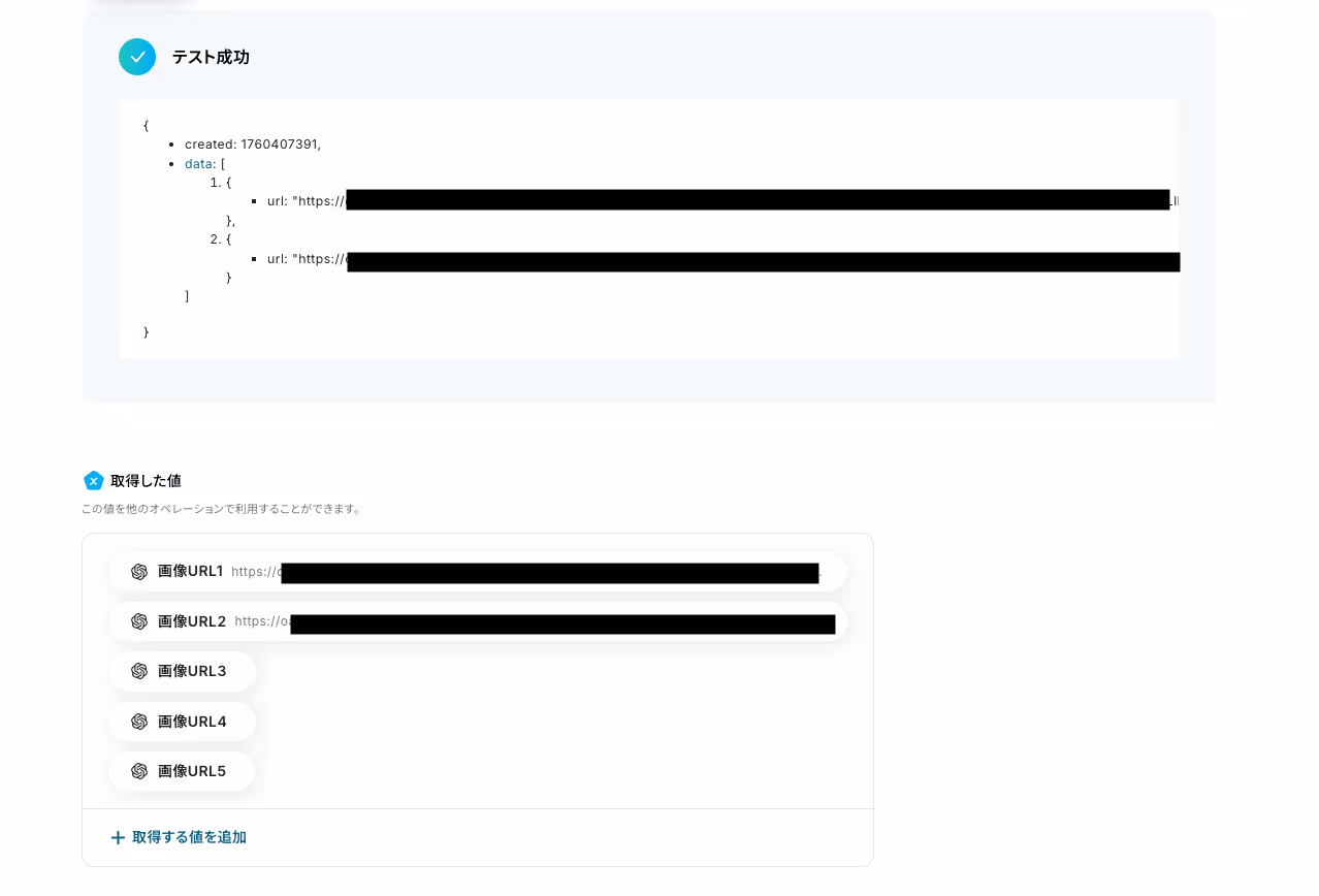 「取得した値」は後続アクションで利用可能です。