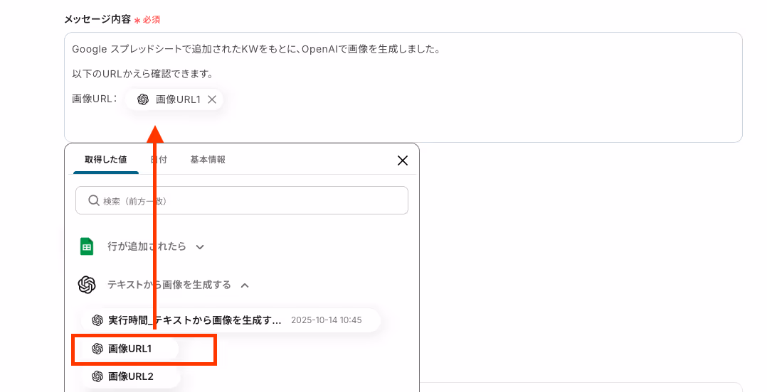「メッセージ内容」では、入力バーをクリックすると、前ステップから取得した情報を引用できます。今回は以下のように設定しました。
