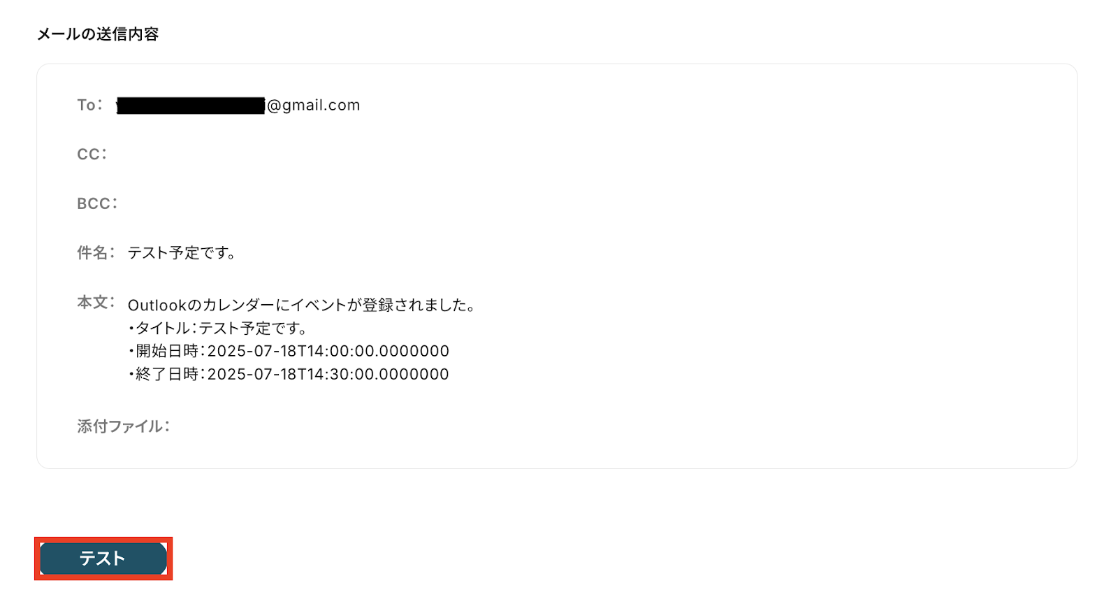 送信先・件名・本文などが正しく設定されているか確認したら「テスト」をクリックして、実際に指定した内容でメールが届くかを確認しましょう。