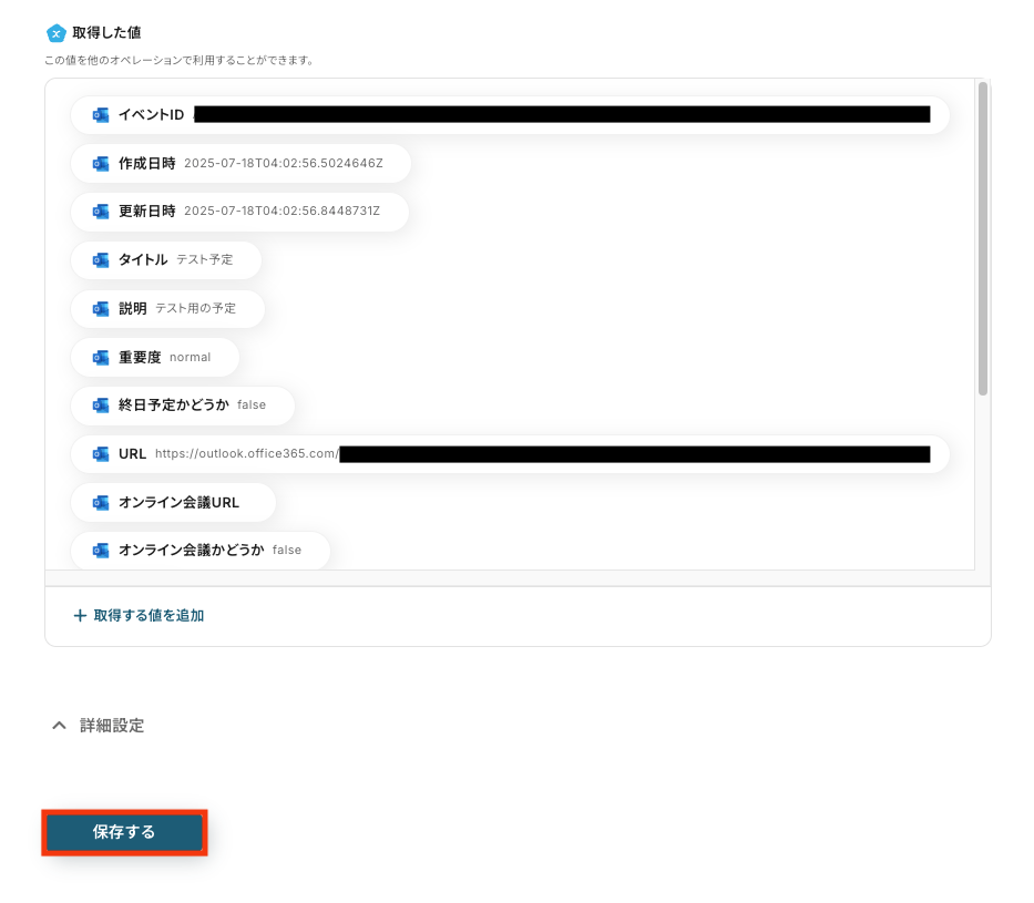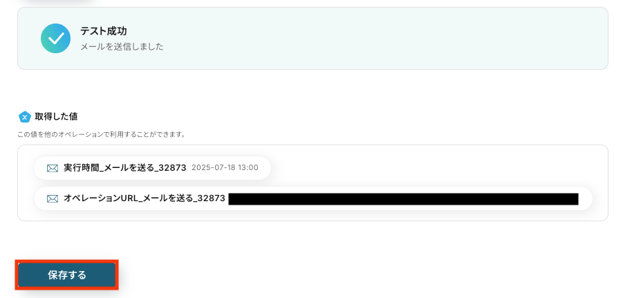 Yoomの操作画面に戻り、取得した値を確認し「保存する」をクリックします。