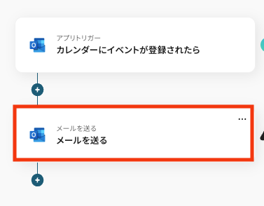 - 最後に、オペレーションでOutlookの「メールを送る」アクションを設定し、イベントが登録されたことを通知するメールが送信されるように設定します。