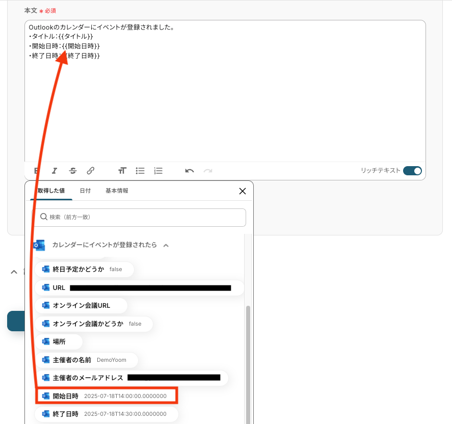 - Outlookでイベントを登録するオペレーションでは、イベントの各項目に対し、AIが抽出した情報や固定のテキストなどを自由に割り当てることが可能です。