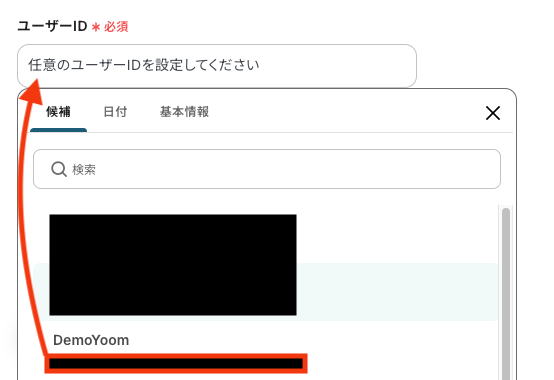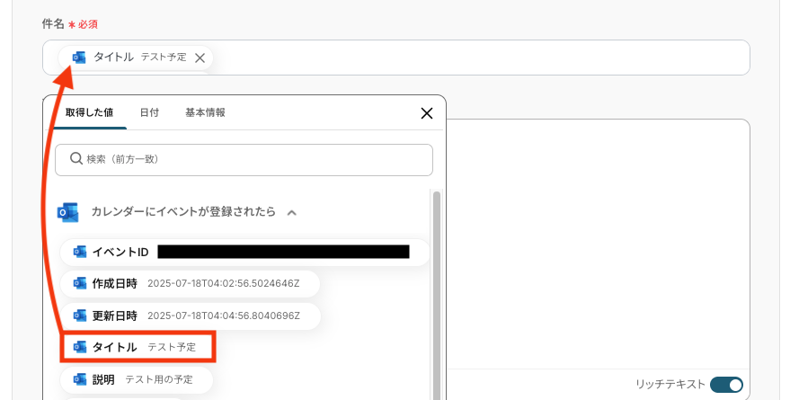 入力欄をクリックすると、前のステップで取得済みのアウトプットが一覧で表示されるので、そこから選択することも可能です。