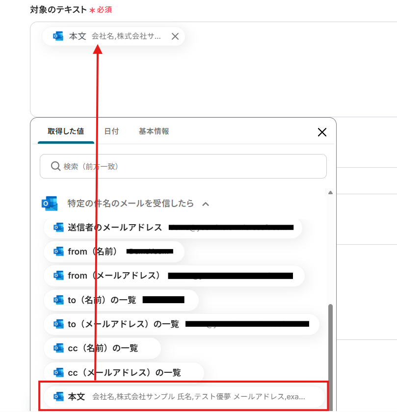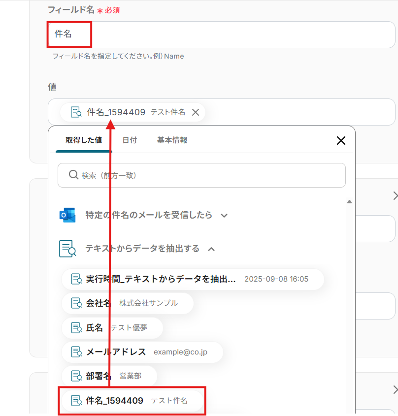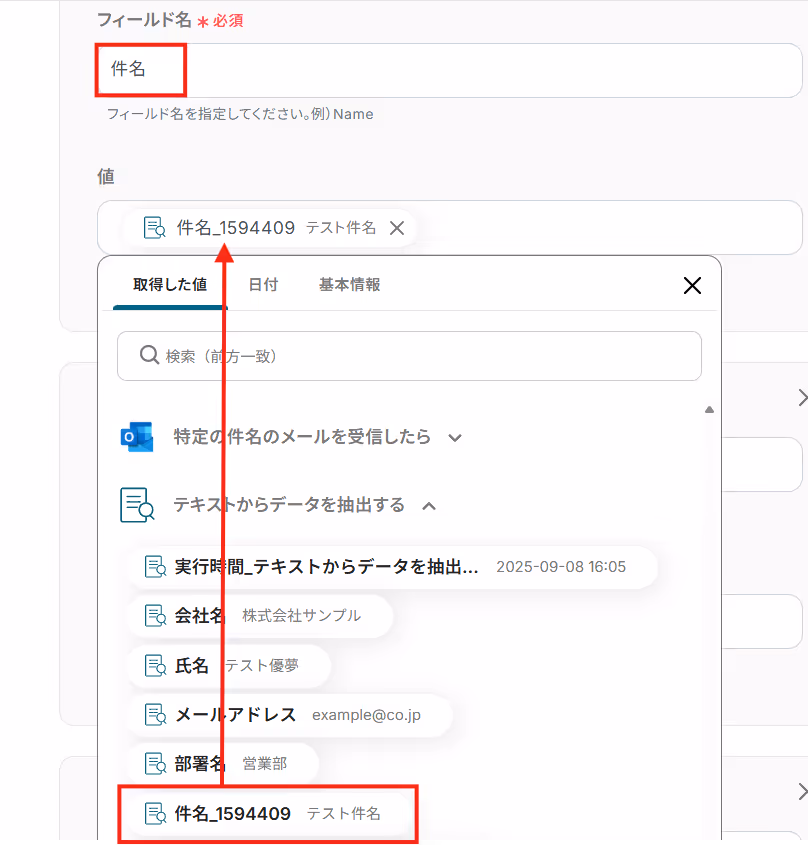 「値」は、入力欄をクリックして表示される取得した値から選択してください。