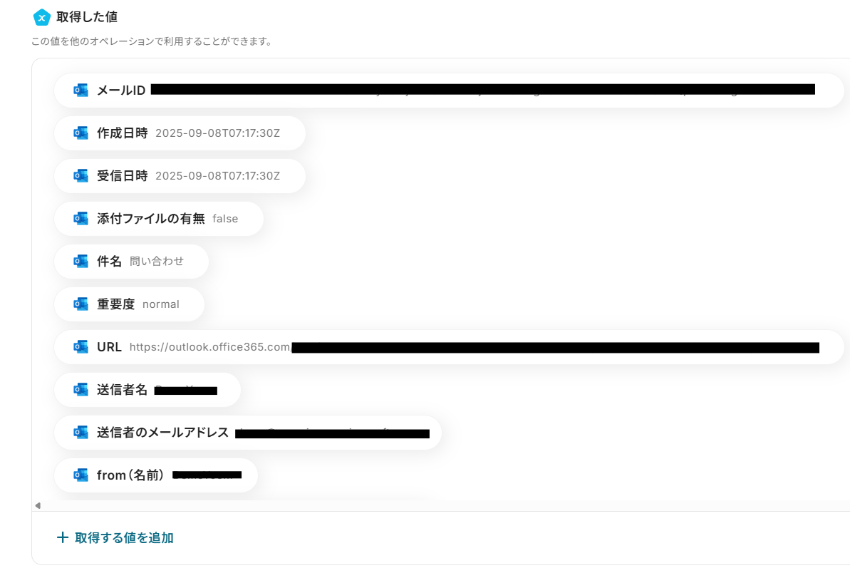 トリガーやオペレーション設定時に、「テスト」を実行して取得した値です。