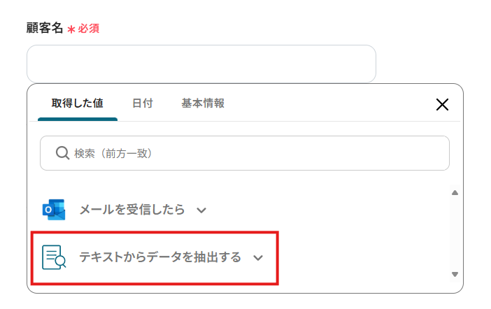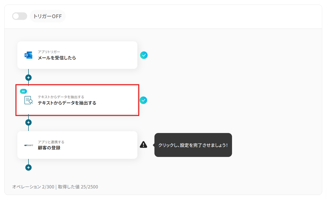 - Outlookのトリガー設定と各アクション(データ抽出・顧客登録)の設定