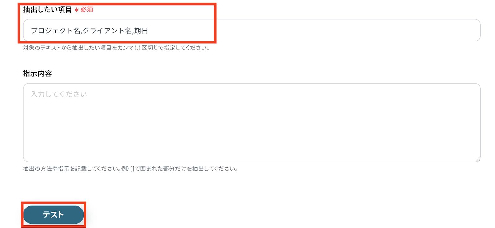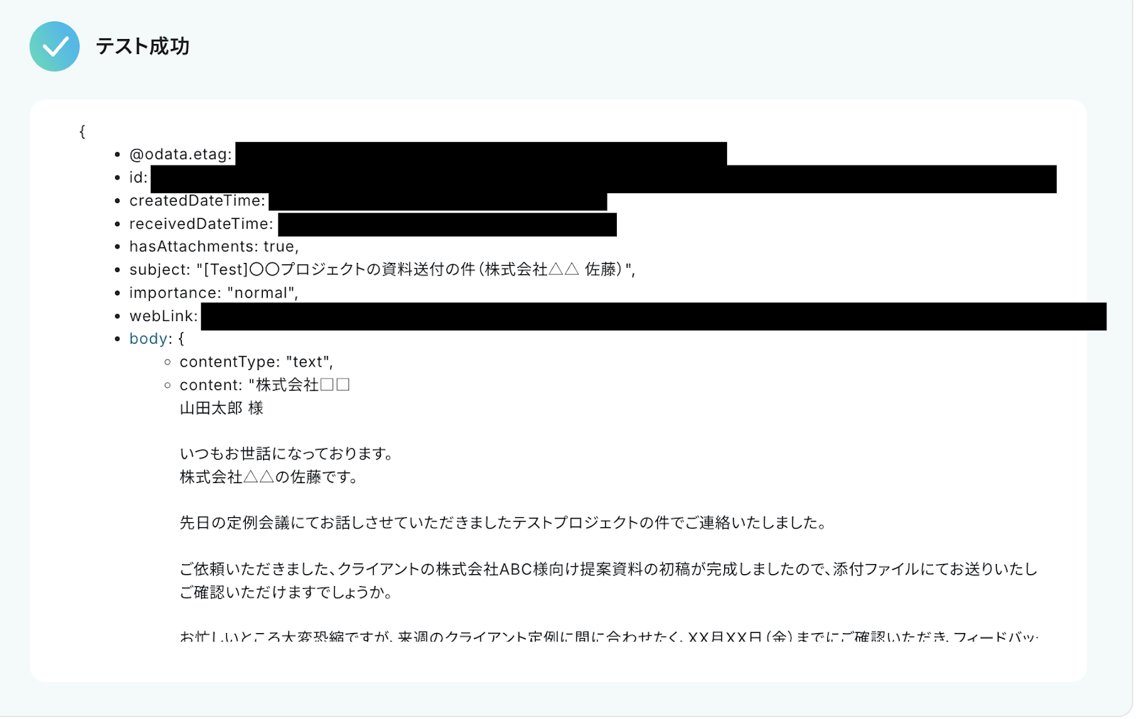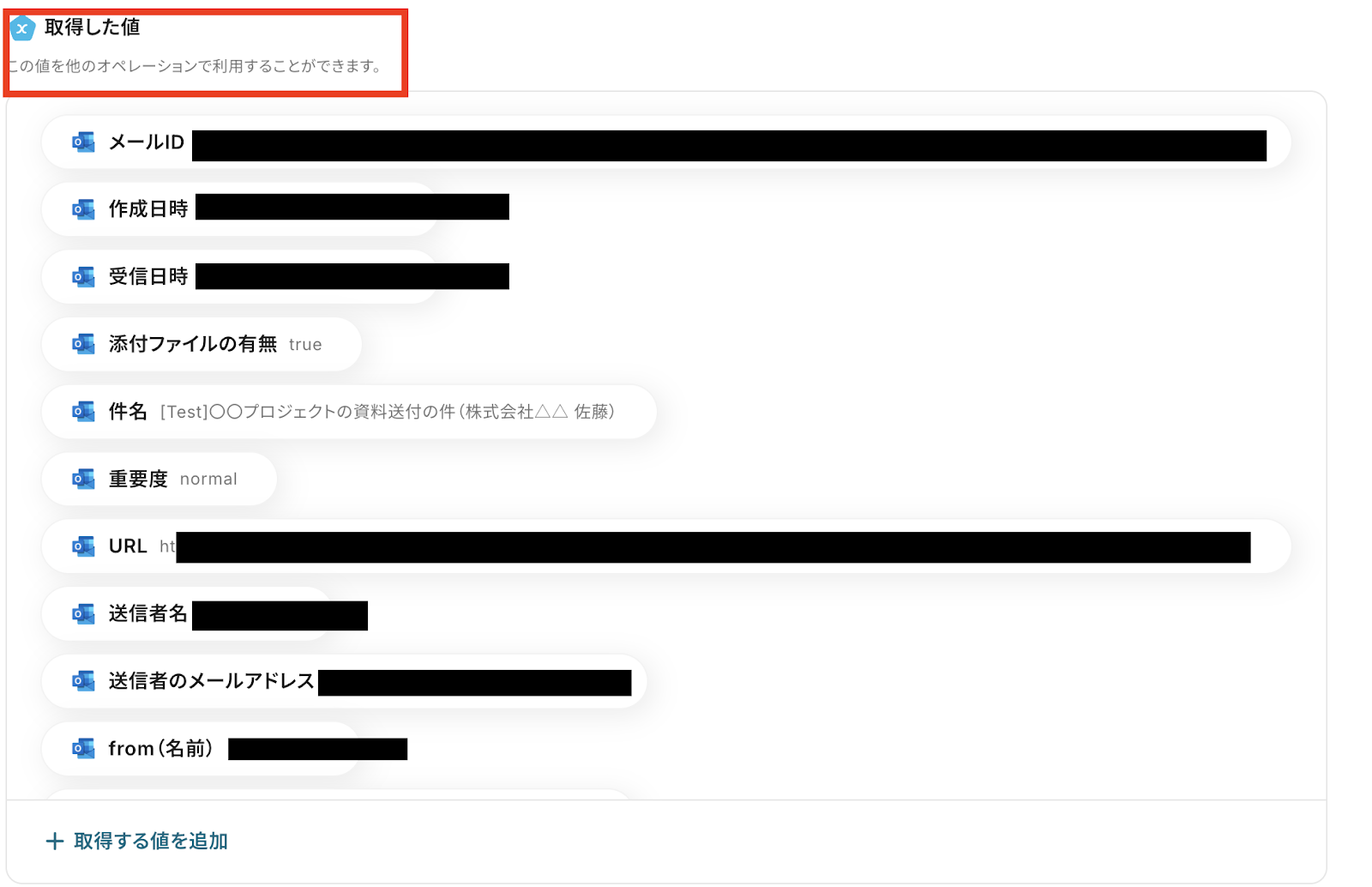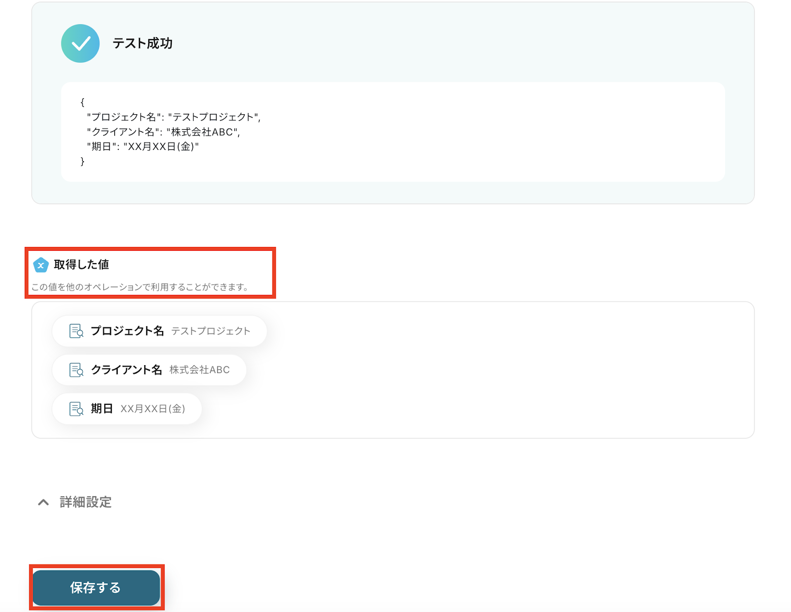 「テスト成功」と表示がされたら、抽出された項目が取得した値に反映されています。