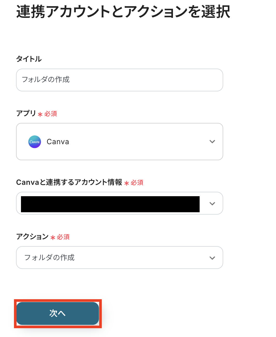 アクションは「フォルダを作成」のままで、アカウント名を確認します。