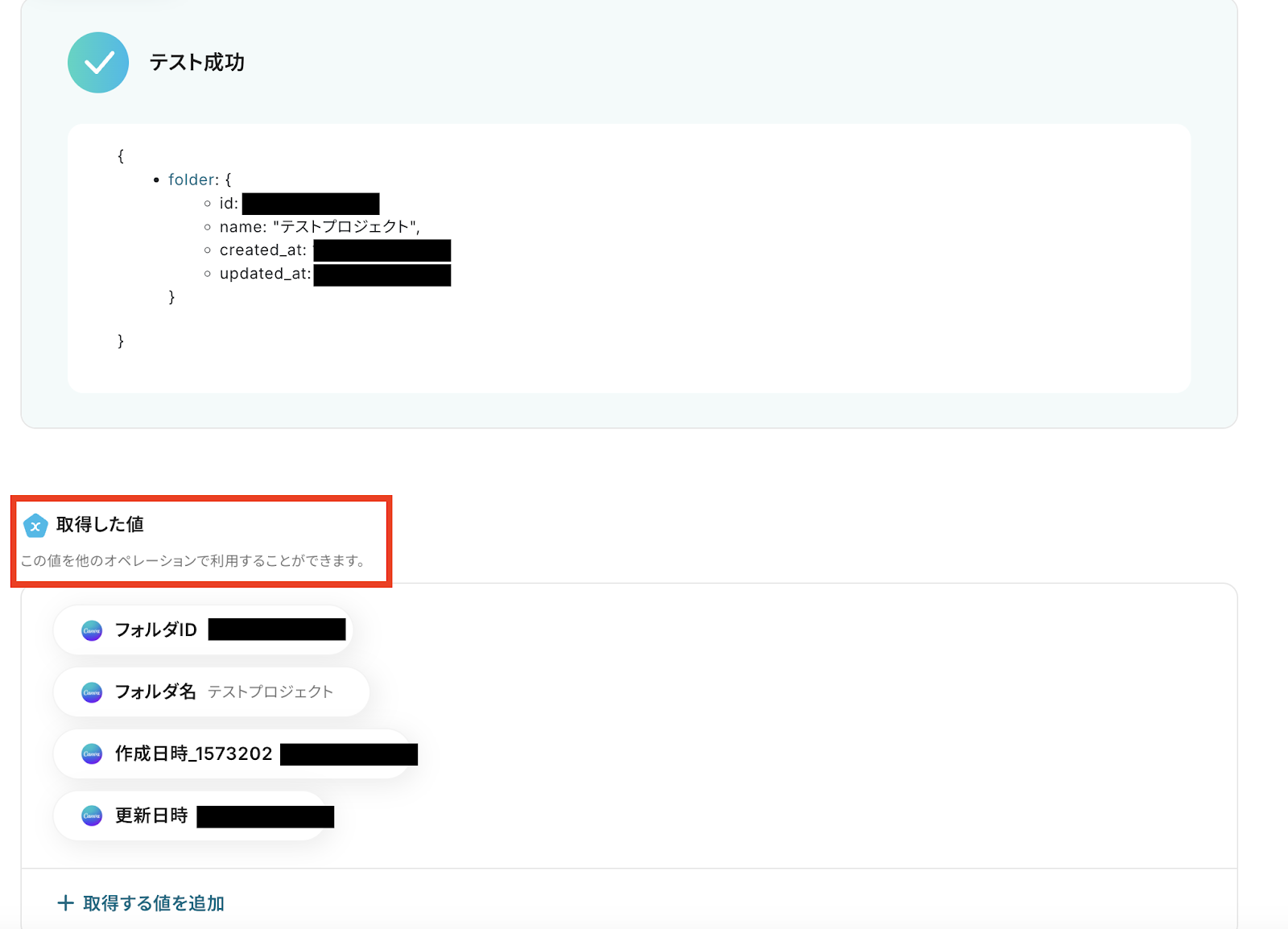 「テスト成功」と表示が出たら、アウトプット(取得した値)が取得されます。