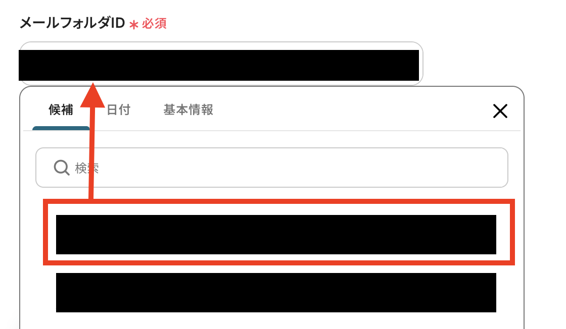 空欄をクリックすると候補が表示されますので、対象のメールフォルダIDを選択しましょう!