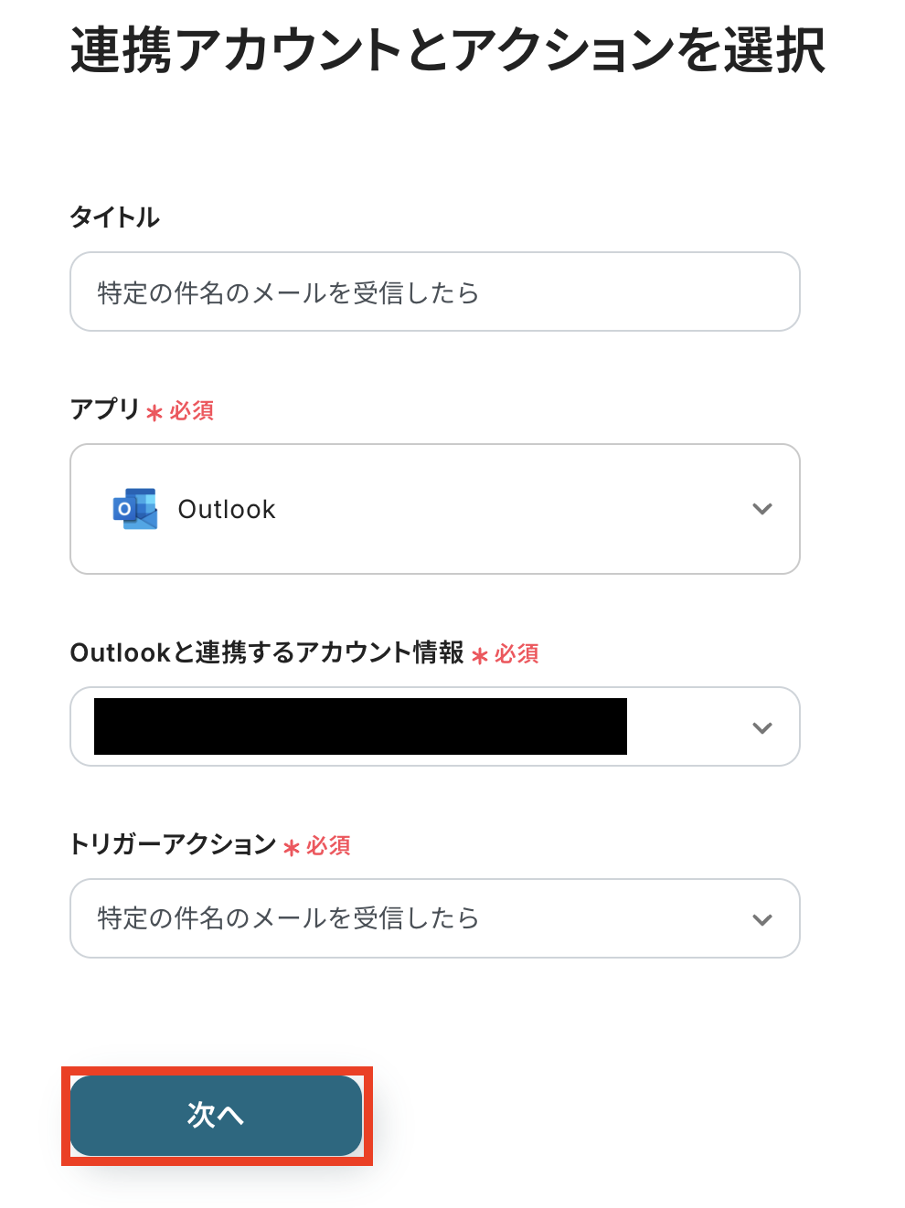 トリガーアクションは、「特定の件名のメールを受信したら」のままで問題ありません。