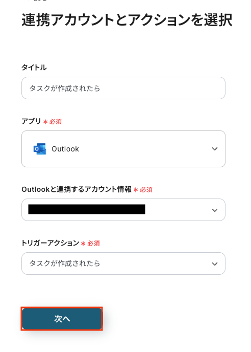 Outlookと連携するアカウント情報に問題がなければ、「次へ」をクリックします。