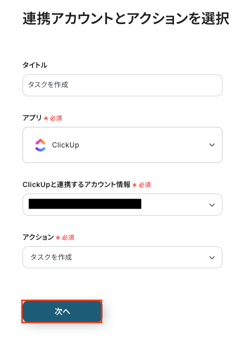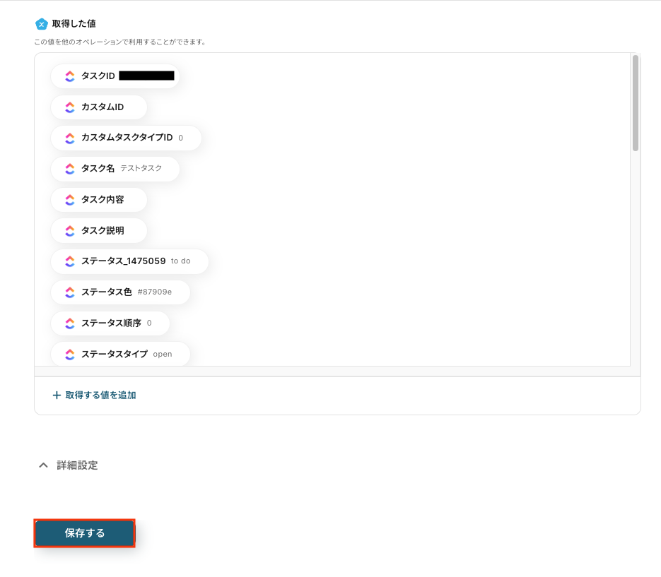 - 最後に、Googleフォームから取得した回答内容を、作成するClickUpタスクのタイトルや詳細などに設定します。