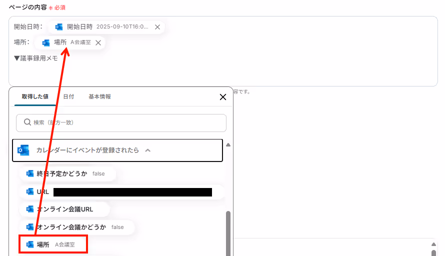 例えば、予定のタイトルに「会議」の文字が含まれている場合にのみページを作成するように設定できます。