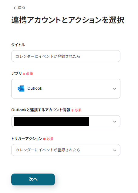 「アプリトリガーのAPI接続設定」で以下の項目を設定していきます。 ここで設定したOutlookユーザーに新規予定が登録されると、フローが開始されるようになります。