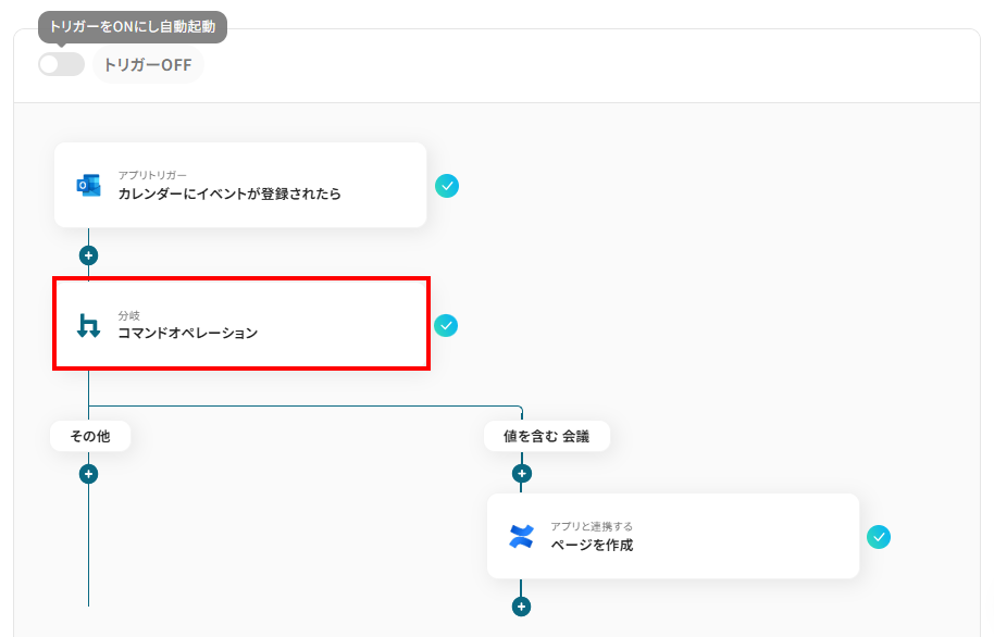 A:ミニプラン以上で利用可能な、分岐オペレーションを活用することで複数の条件を組み合わせることが可能です。 例えば、予定のタイトルに「会議」の文字が含まれている場合にのみページを作成するように設定できます。