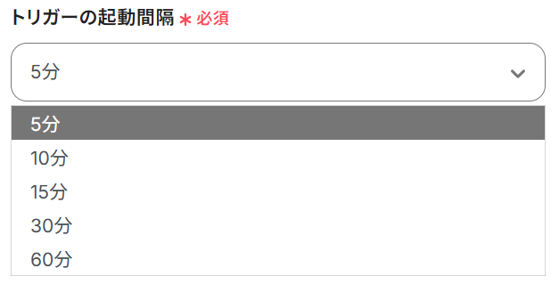 トリガーの起動間隔:5分、10分、15分、30分、60分のいずれかで設定できます。ご利用プラン によって、設定できるトリガーの最短間隔が違うので、その点は要チェックです。 なお、基本的にはそのプランの最短の起動間隔にしてお使いいただくことをおすすめします。