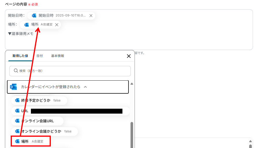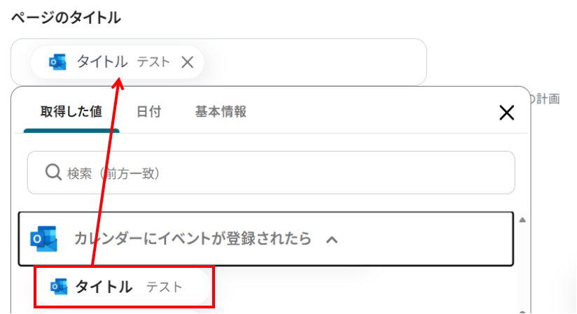 フォルダのタイトル:こちらには、下記画像のようにOutlookで取得した情報を選択してください。 取得した値を用いて以下のように設定することで、Outlookで予定が作成されるごとに異なるページタイトルを動的に反映できます。 なお、取得した値を活用せず手入力すると、毎回同じページタイトルが作成されてしまうため注意が必要です。