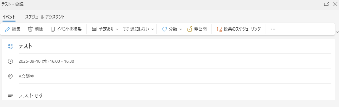 入力が完了したら、テスト操作の前にOutlookに新規の予定を作成しておきましょう。 作成する予定は、架空の情報(「テスト」や「A会議室」など)でOKです。 今回は、下記のような予定を作成しました。