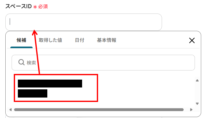 スペースID:こちらも入力欄をクリックして選択します。 クラウドID→スペースIDの順番で設定しないと、上手く表示されないので注意してください。