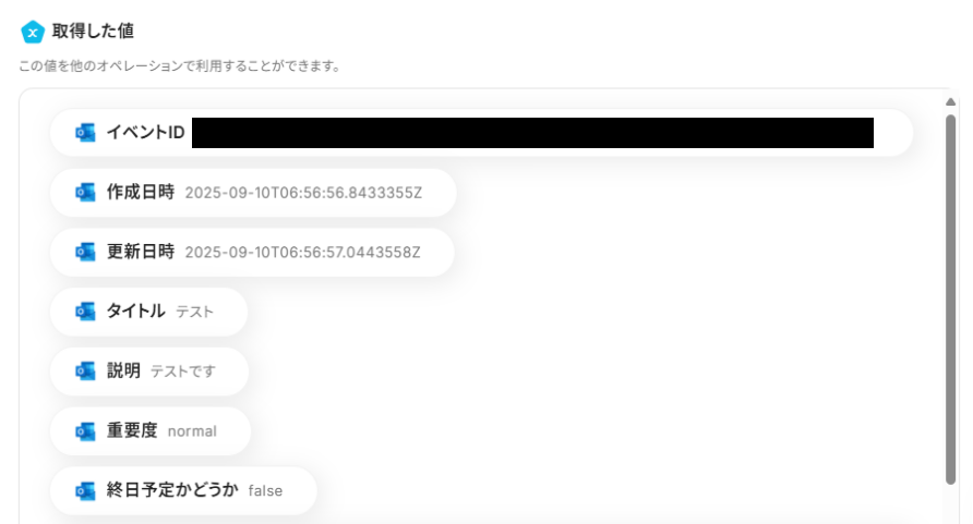 Outlookの準備が整ったら、Yoom画面に戻って「テスト」ボタンをクリックしましょう。 成功すると、「取得した値」にOutlookの情報が反映されるはずです。 この値は、次のステップで活用します!