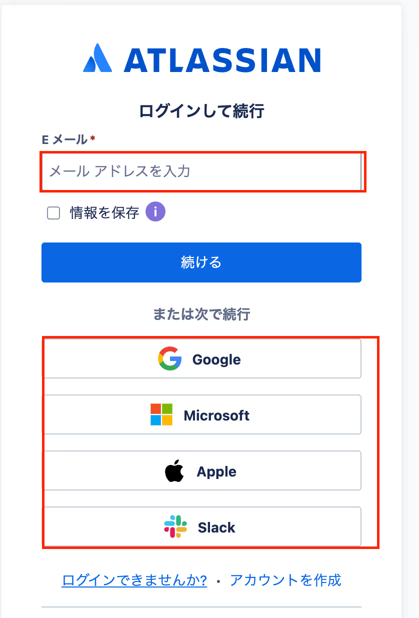 Confluenceにログインします。 Eメールアドレスを入力するか、他のログイン方法を選択してください。 ここではGoogleアカウントでログインしていきます。