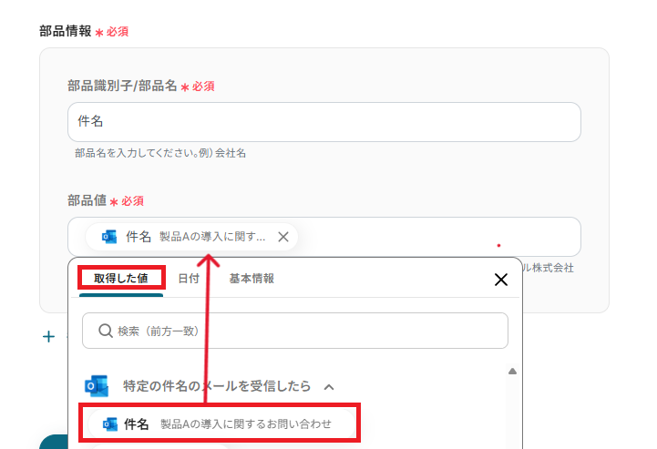 - 部品値:取得した値を使って入力(固定値は直接入力)