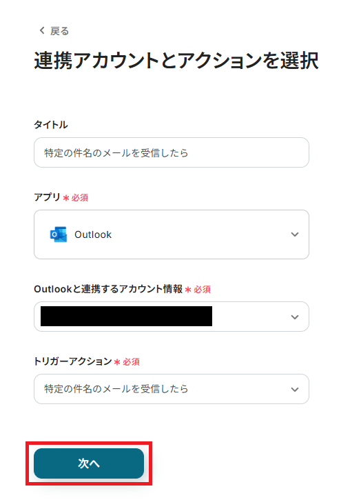 Outlookと連携するアカウントに間違いがないかも確認し、「次へ」をクリックしましょう。