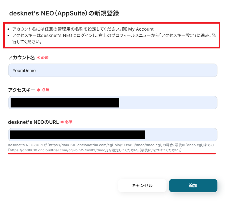 「アカウント名」「アクセスキー」「desknet's NEOのURL」を赤枠と注釈に沿って入力し、追加をクリックしましょう。