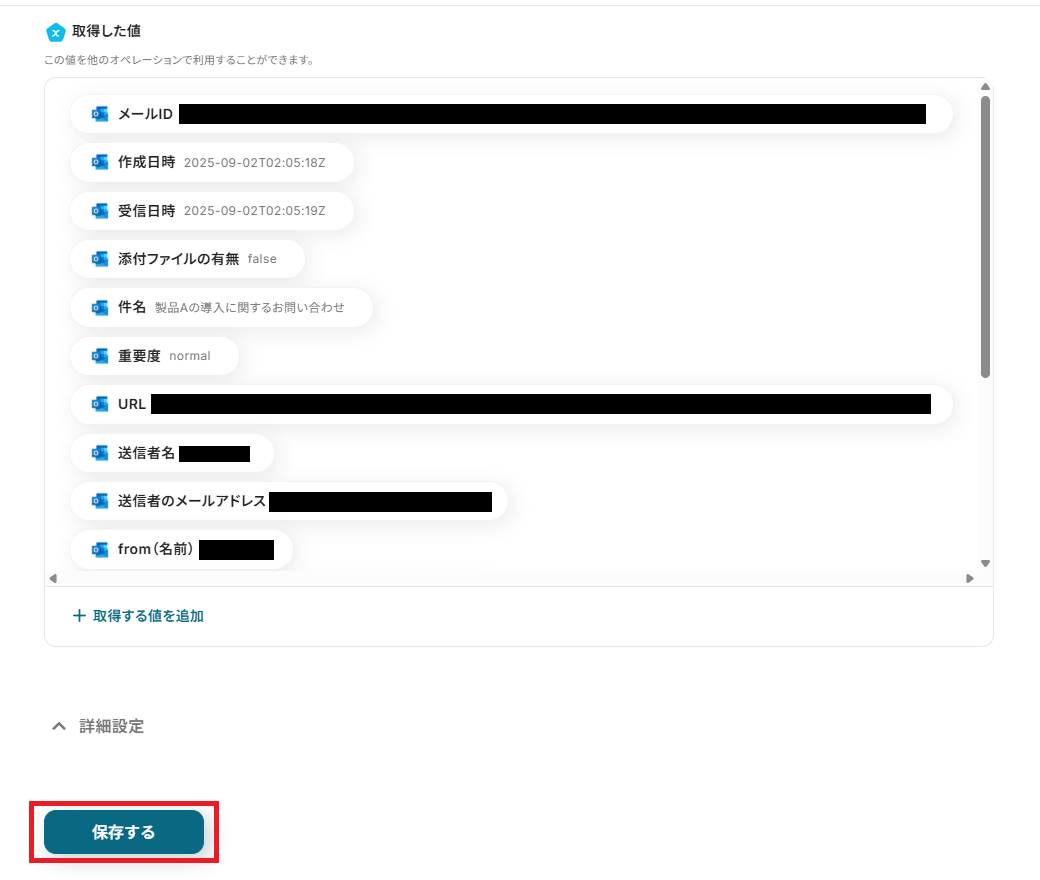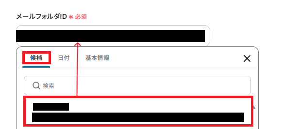 「メールフォルダID」は先ほど作成したメールが振り分けられたフォルダを、候補から選択しましょう。