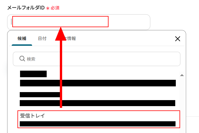 入力欄をクリックすると、先ほどOutlookと連携するアカウント情報で選択したアカウント内にあるフォルダの一覧が表示されます。